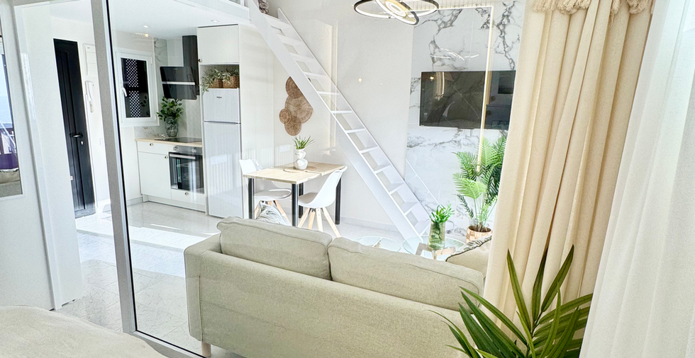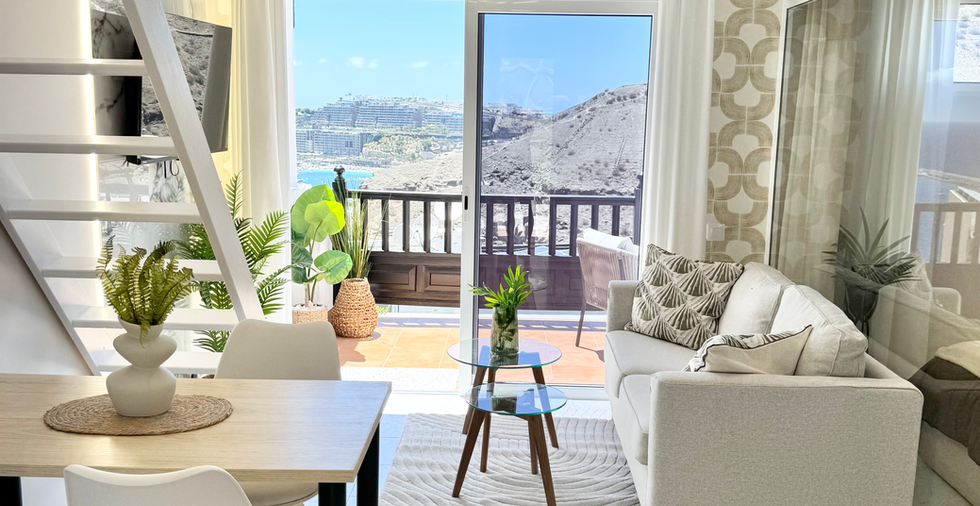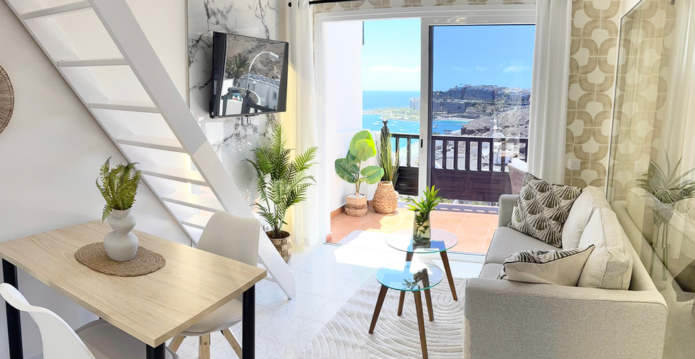 Det delikate soverommet er adskilt fra stuen med en glassvegg som kan lukkes igjen mot resten av leiligheten. Leiligheten har et nyoppusset og arealeffektivt bad med dusj og vaskemaskin. Fra stuen er det nydelig utsikt mot Anfi stranden. I tillegg finnes det en hems i leiligheten som gir 2 ekstra soveplasser, noe som gjør at leiligheten også fungerer for 4 personer.