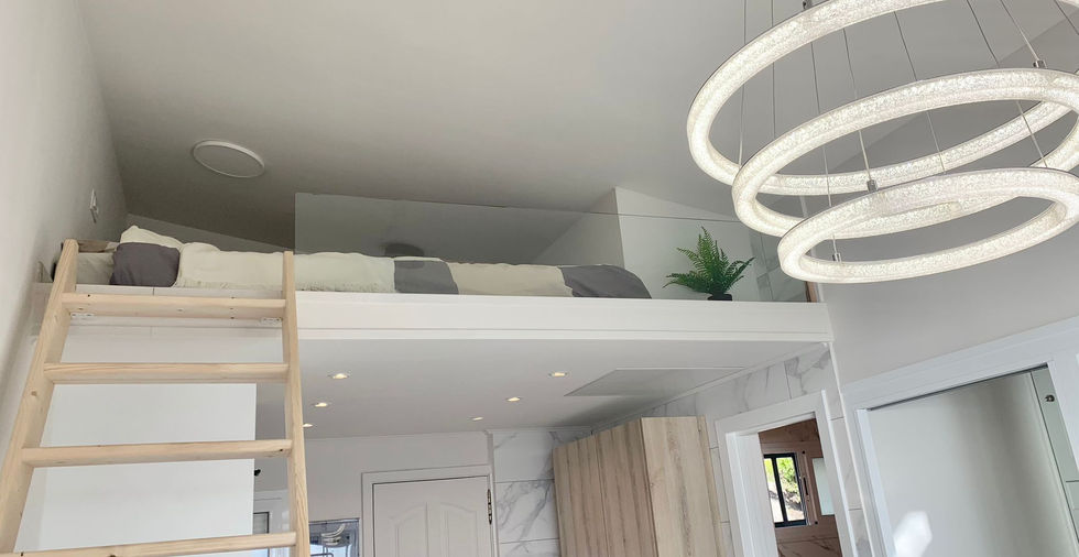 Det er delt av inn til soverom med en flott glassvegg som gjør at leiligheten beholder romfølelsen. I tillegg er det laget en hems over kjøkken som gjør det mulig å oppholde seg 4 personer.