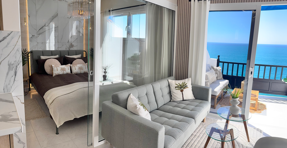 Det delikate soverommet er adskilt fra stuen med en glassvegg som kan lukkes igjen mot resten av leiligheten. Leiligheten har et nyoppusset og arealeffektivt bad. Fra stuen er det lekker utsikt mot Anfi stranden. I tillegg finnes det en hems i leiligheten som gir 2 ekstra soveplasser, noe som gjør at leiligheten også fungerer for 4 personer.